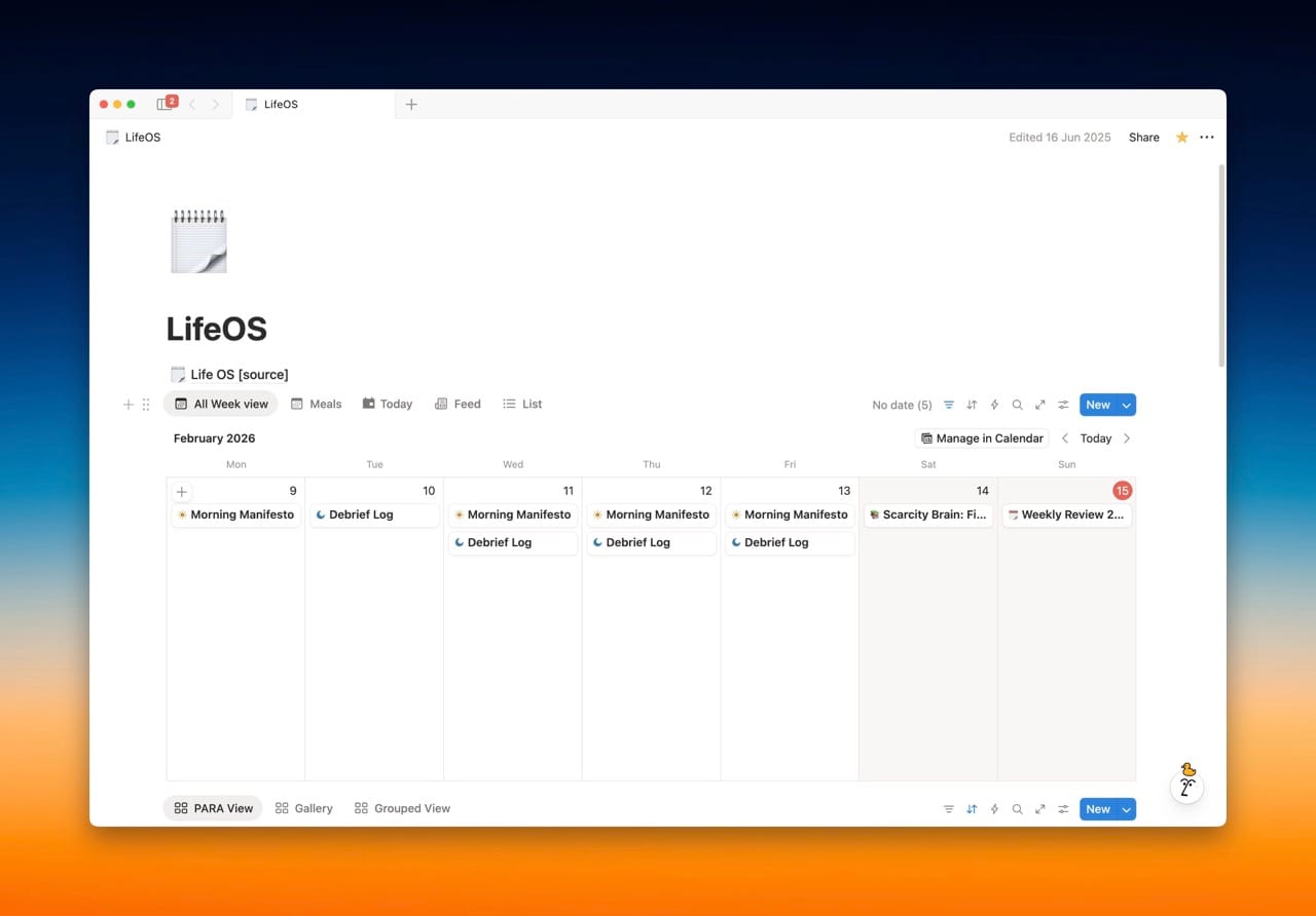 I don’t use Notion as a traditional notes app. For me, it functions more like project software. The main hub I’ve built is something I call LifeOS, which I use as a weekly calendar view. Within that, I create a series of notes that form a kind of timeline. Morning manifestos, daily debriefs, weekly reviews (this is all inspired by Ali Abdaal’s LifeOS system/course, and I’ve added some of my own).