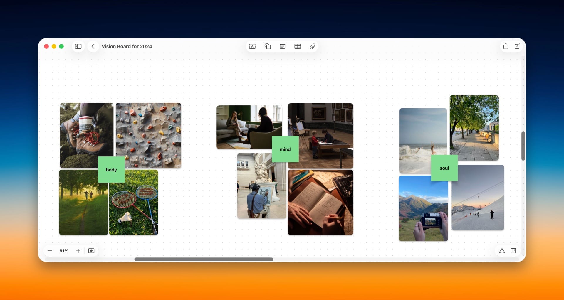 Examples of use cases. L-R: vision board, visual planning, branding/font planning